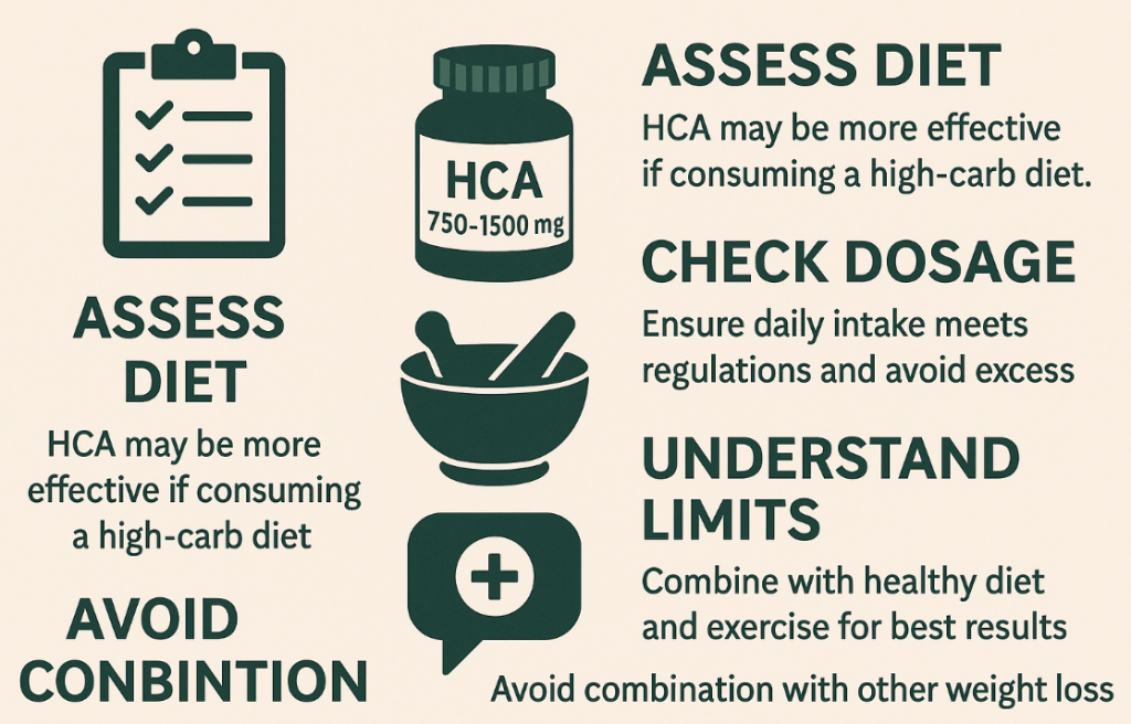 - 식약처 기준을 준수해야 한다. 제품 선택 시 HCA 함량이 일일 섭취량 기준(750~1500mg)을 충족하는지 확인하고 과다 섭취를 피해야 한다.